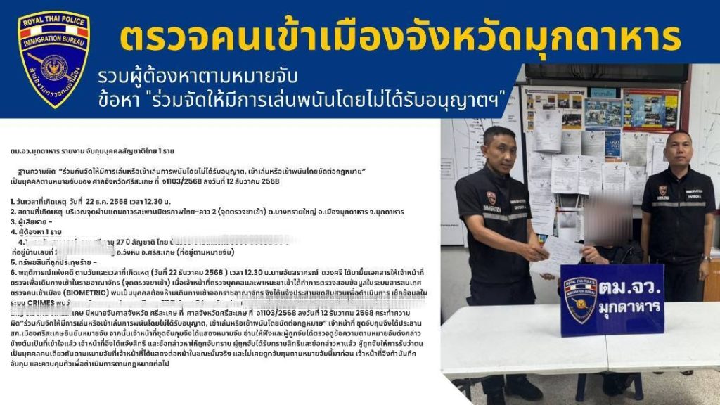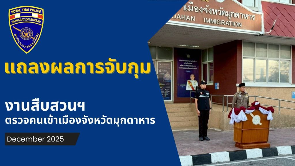 วันนี้ (31 ธ.ค.68) เวลาประมาณ 10.00 น. ภายใต้อำนวยการสั่งการของ พล.ต.ต.ไพรัช พุกเจริญ ผบก.ตม.4, พ.ต.อ. กฤษฎากรณ์ กลิ่นเกสร, พ.ต.อ.มณุวัฒน์ กอสนาน รอง ผบก.ตม.4 และ พ.ต.อ.ธนิสร แสงท่านั่ง ผกก.ตม.จว.มุกดาหาร โดย พ.ต.ท.จตุพล ยันต์นาวา รอง ผกก.ตม.จว.มุกดาหาร และ พ.ต.ต.หญิง กัญสุชญา จีรพุทธางกูร สว.ตม.จว.มุกดาหาร พร้อมด้วยเจ้าหน้าที่ชุดสืบสวนฯ ตม.จว.มุกดาหาร ได้แถลงข่าวผลการจับกุม ห้วงเดือนธันวาคม 2568 ดังนี้