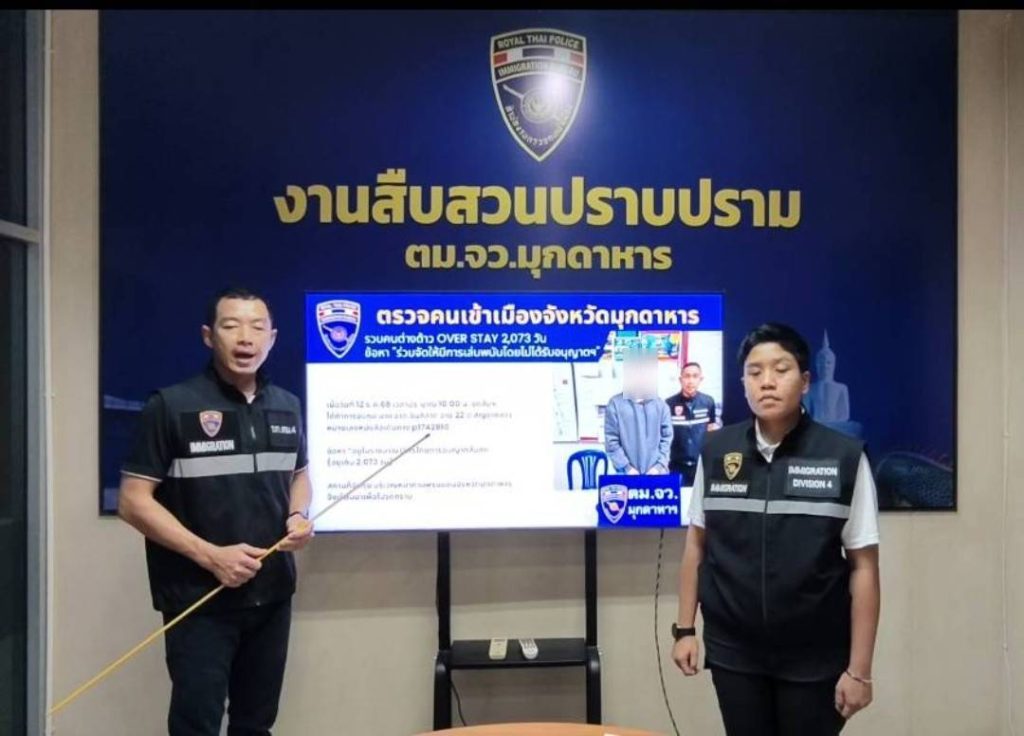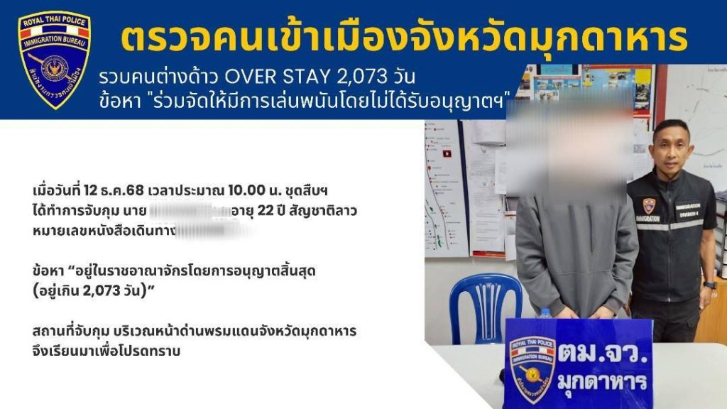 จับกุม นายแก้ว (นามสมมุติ) อายุ 22 ปี สัญชาติ ลาว ข้อหา “อยู่ในราชอาณาจักรโดยการอนุญาตสิ้นสุด” จำนวน 2,073 วัน นำตัวผู้ต้องหาส่งพนักงานสอบสวน สภ.เมืองมุกดาหาร เพื่อดำเนินคดีตามกฎหมายต่อไป