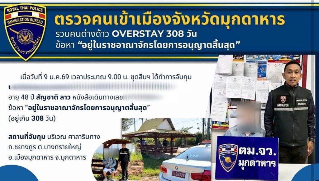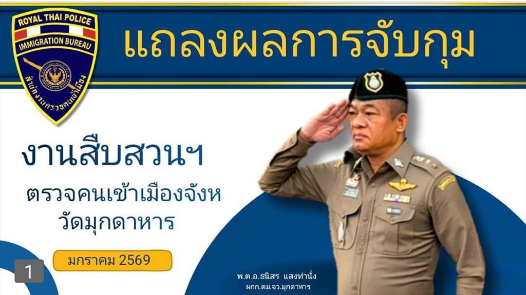 ได้แถลงข่าวผลการจับกุม เดือนมกราคม 2569 ห้วงที่ผ่านมา ดังนี้ นายวัน (นามสมมุติ) อายุ 48 ปี สัญชาติ ลาว ข้อหา “อยู่ในราชอาณาจักรโดยการอนุญาตสิ้นสุด” จำนวน 308 วัน นำตัวผู้ต้องหาส่งพนักงานสอบสวน สภ.เมืองมุกดาหาร เพื่อดำเนินคดีตามกฎหมายต่อไป