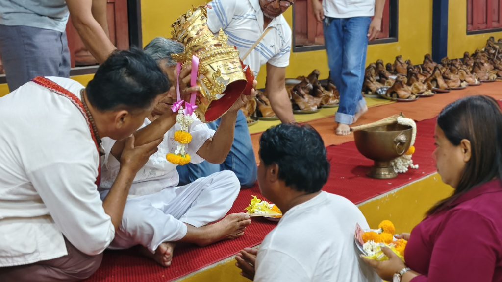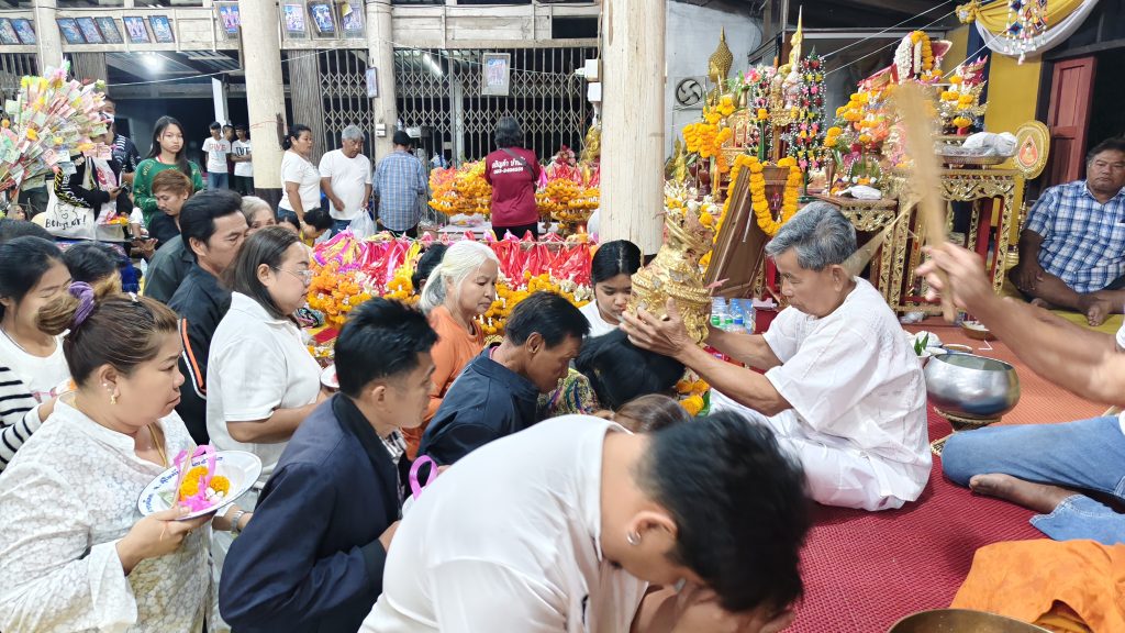จากนั้นได้ทำพิธีสวดมนต์ พิธีครอบครูโดยตาบันเทิง รื่นพงษ์ อายุ 75 ปี เป็นเจ้าพิธีครอบครูให้กับบรรดาลูกศิษย์ โดยคุณตาบันเทิง เป็นลูกของหลวงพ่อปลั่ง ที่สืบทอดวิชาอาคมมาจากหลวงพ่อปลั่ง ทีเสียชีวิตไปแล้ว