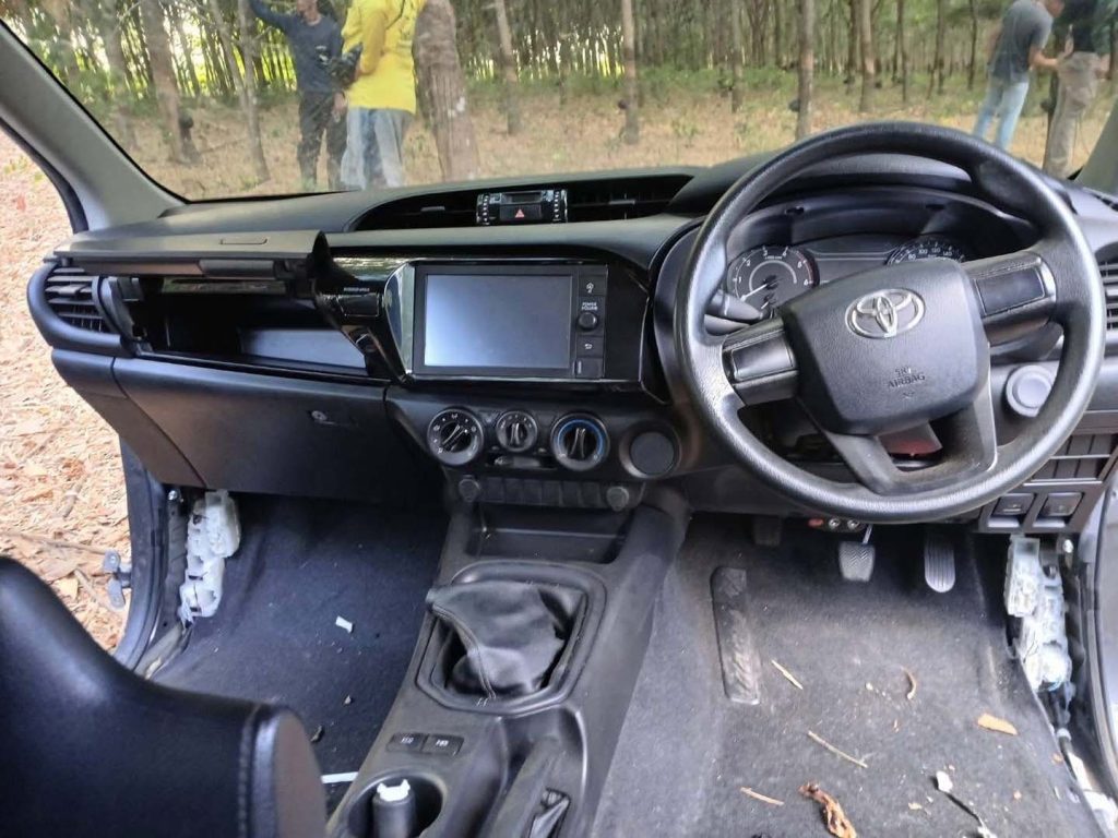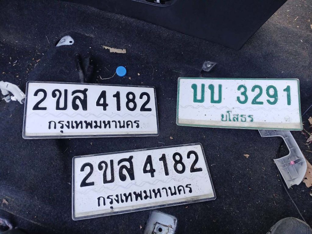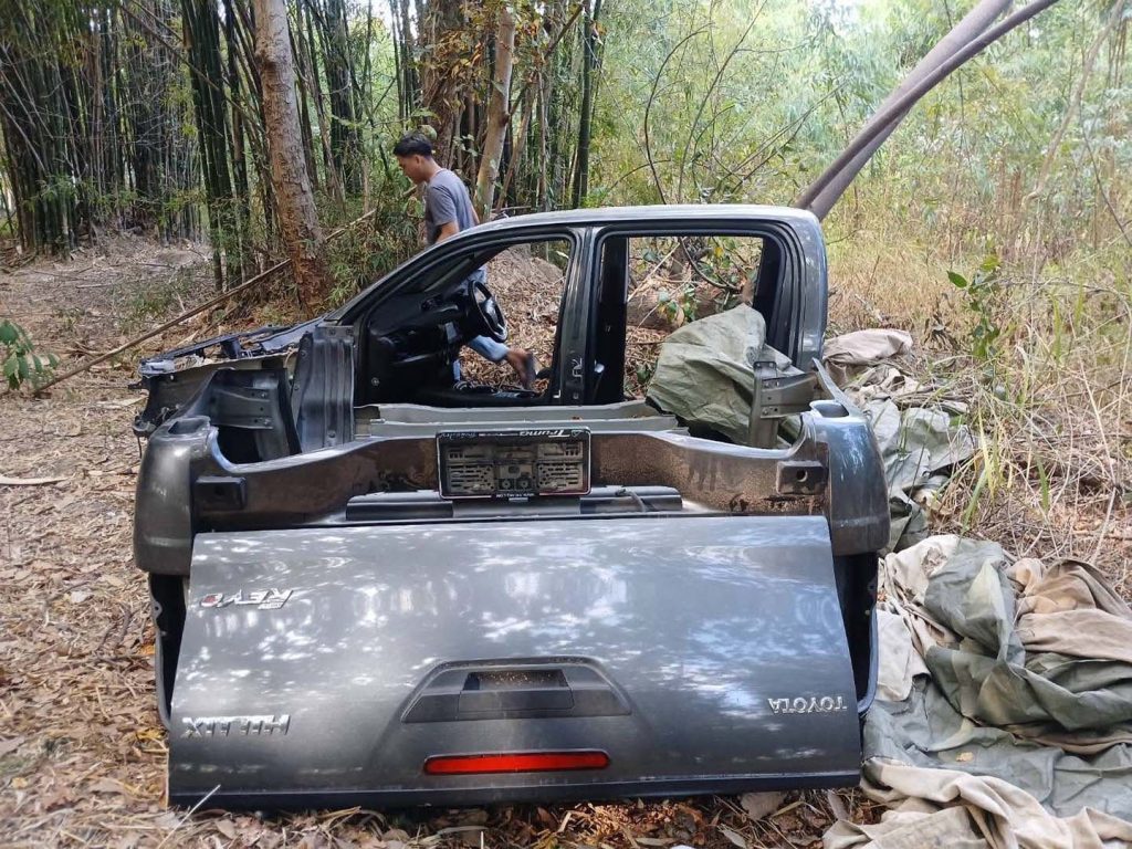ต่อมาเจ้าหน้าที่ชุดจับกุมได้ลงพื้นที่พบของกลาง1.ซากรถยนต์ ยี่ห้อ โตโยต้า รีโว่ สีขาว ป้ายทะเบียน บบ-3291 ยโสธร หมายเลขตัวถัง MR0JBBCC90182582 หมายเลขเครื่องยนต์ 2GD5335535 พร้อมกุญแจรถยนต์ 2.ซากรถยนต์ ยี่ห้อ โตโยต้า รีโว่ เทา ป้ายทะเบียน 2ขส-4182 กรุงเทพมหานคร หมายเลขตัวถัง MR0CBBCD70041738 หมายเลขเครื่องยนต์ 2GD1151427 , กระบะท้ายรถยนต์โตโยต้า รีโว่ สีเทา พร้อมกุญแจรถยนต์ 3. โครงรถ ระบุหมายเลขแชสซี MR0JBBCC90182582 4. โครงรถ ระบุหมายเลขแชสซี MR0CBBCD70041738 5. ท่อรถยนต์จำนวน 2 ชิ้น