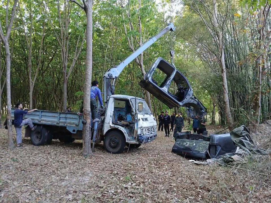 จากนั้นเจ้าหน้าที่ได้ตรวจสอบบริเวณดังกล่าว ไม่พบผู้ใดแสดงตนเพื่อเป็นเจ้าของสวนยางพารา เจ้าหน้าที่จึงได้ตรวจยึดของกลางทั้งหมด และจะได้ติดตามตัวเจ้าของสวนยางพารามาสอบสวนหาที่มาของซากรถดังกล่าว ก่อนนำของกลางทั้งหมดส่ง พนักงานสอบสวน สภ.ดอนตาล เพื่อดำเนินคดีตามกฏหมายต่อไป..