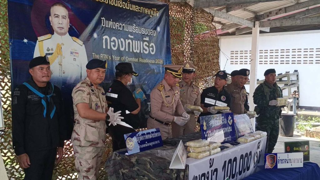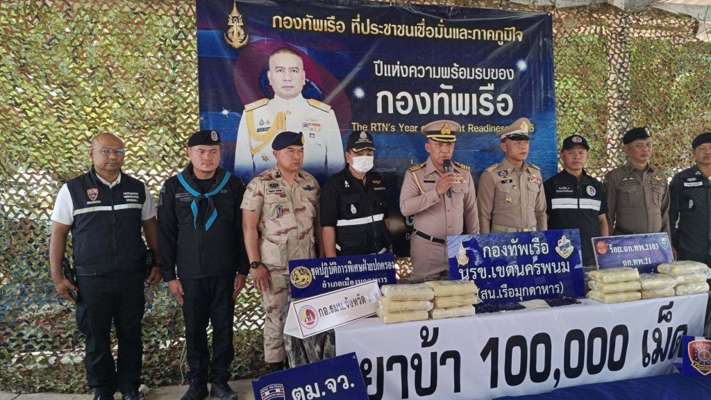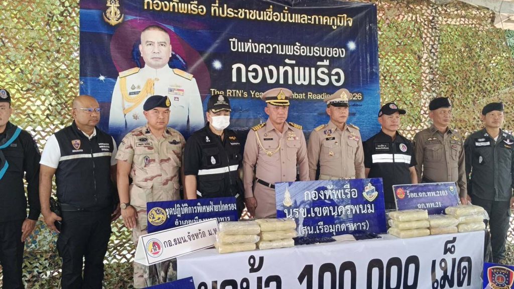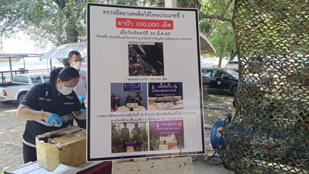 วันที่ 31 มีนาคม 2569 พล.ร.ต.ณรงค์ เอมพี ผู้บัญชาการหน่วยเรือรักษาความสงบเรียบร้อยตามลำแม่น้ำโขง น.อ.แมนรัตน์ บุญสวัดิ์ ผู้บังคับหน่วยเรือรักษาความสงบเรียบร้อยตามลำแม่น้ำโขง เขตนครพนม น.อ.ปุณณรัตน์ ถมคำ หัวหน้ายุทธการและการข่าวหน่วยเรือรักษาความสงบเรียบร้อยตามลำแม่น้ำโขง เขตนครพนม น.ท.โอรส พุทธโค หัวหน้าสถานีเรือมุกดาหารหน่วยเรือรักษาความสงบเรียบร้อยตามลำแม่น้ำโขง กองทัพเรือ ร่วมกับนายอำเภอเมืองมุกดาหาร ตรวจคนเข้าเมืองมุกดาหาร ตชด.234 ทหารพรานที่ 2105 ตำรวจน้ำ และพิสูจน์หลักฐาน ร่วมกันจับกุมยาเสพติดให้โทษประเภท 1 (ยาบ้า) จำนวน 100,000 เม็ด ที่บริเวนริมฝั่งแม่น้ำโขง ชุมชนอนุรักษ์บำรุง ถนนสำราญชายโขงใต้ ตำบลศรีบุญเรือง อำเภอเมือง จังหวัดมุกดาหาร