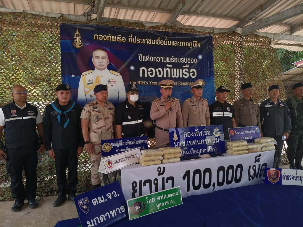 มุกดาหาร- หน่วยเรือรักษาความสงบเรียบร้อยตามลำแม่น้ำโขง กองทัพเรือ (นรข.) สนธิกำลังหน่วยความมั่นคงในพื้นที่ ตรวจยึดยาบ้าจำนวน 100,000 เม็ด ลักลอบนำเข้าจากประเทศเพื่อนบ้าน ส่วนผู้ต้องหาหลบหนีไปได้